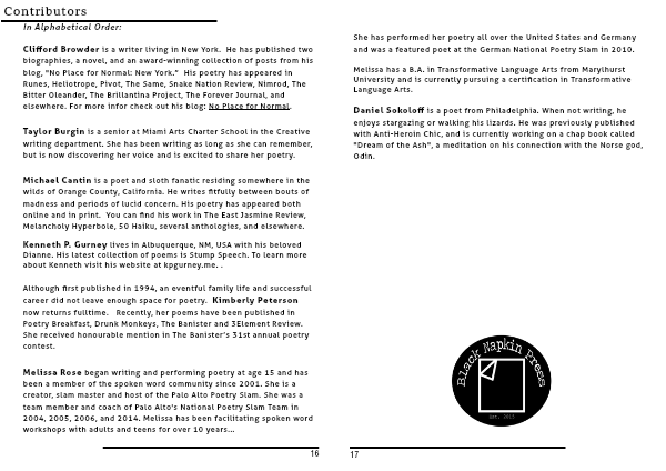 Michael Cantin is a poet and sloth fanatic residing somewhere in the wilds of Orange County, California. He writes fitfully between bouts of madness and periods of lucid concern. His poetry has appeared both online and in print. You can find his work in The East Jasmine Review, Melancholy Hyperbole, 50 Haiku, several anthologies, and elsewhere.