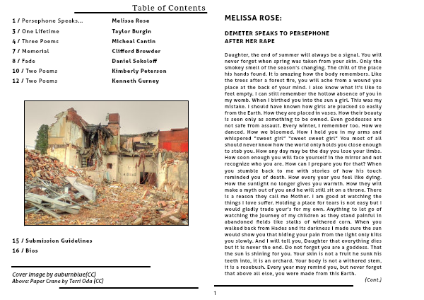 Daughter, the end of summer will always be a signal. You will never forget when spring was taken from your skin. Only the smokey smell of the season’s changing. The chill of the place his hands found. It is amazing how the body remembers. Like the trees after a forest fire, you will ache from a wound you place at the back of your mind. I also know what it's like to feel empty. I can still remember the hollow absence of you in my womb. When I birthed you into the sun a girl. This was my mistake. I should have known how girls are plucked so easily from the Earth. How they are placed in vases. How their beauty is seen only as something to be owned. Even goddesses are not safe from assault. Every winter, I remember too. How we danced. How we bloomed. How I held you in my arms and whispered “sweet girl” “sweet sweet girl” You most of all should never know how the world only holds you close enough to stab you. How any day may be the day you lose your limbs. How soon enough you will face yourself in the mirror and not recognize who you are. How can I prepare you for that? When you stumble back to me with stories of how his touch reminded you of death. How every year you feel like dying. How the sunlight no longer gives you warmth. How they will make a myth out of you and he will still sit on a throne. There is a reason they call me Mother. I am good at watching the things I love suffer. Holding a place for tears is not easy but I would gladly trade your’s for my own. Anything to let go of watching the journey of my children as they stand painful in abandoned fields like stalks of withered corn. When you walked back from Hades and its darkness I made sure the sun would show you that hiding your pain from the light only kills you slowly. And I will tell you, Daughter that everything dies but it is never the end. Do not forget you are a goddess. That the sun is shining for you. Your skin is not a fruit he sunk his teeth into, it is an orchard. Your body is not a withered stem, it is a rosebush. Every year may remind you, but never forget that above all else, you were made from this Earth.