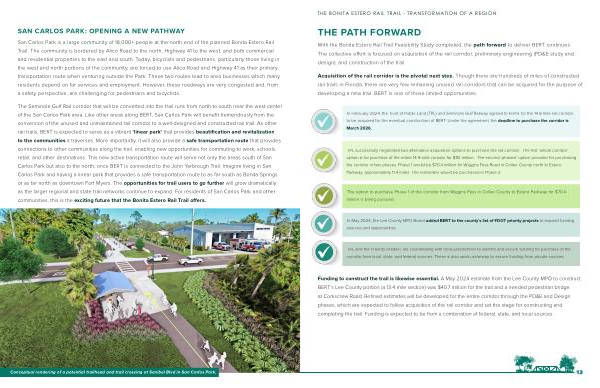 The Seminole Gulf Rail corridor that will be converted into the trail runs from north to south near the west center of the San Carlos Park area . Like other areas along BERT , San Carlos Park will benefit tremendously from the conversion of the unused and unmaintained rail corridor to a well-designed and constructed rail trail . As other rail trails , BERT is expected to serve as a vibrant ‘ linear park ’ that provides beautification and revitalization to the communities it traverses . More importantly , it will also provide a safe transportation route that provides connections to other communities along the trail , enabling new opportunities for commuting to work , schools , retail , and other destinations . This new active transportation route will serve not only the areas south of San Carlos Park but also to the north , once BERT is connected to the John Yarbrough Trail . Imagine living in San Carlos Park and having a linear park that provides a safe transportation route to as far south as Bonita Springs or as far north as downtown Fort Myers . The opportunities for trail users to go further will grow dramatically as the larger regional and state trail networks continue to expand . For residents of San Carlos Park and other communities , this is the exciting future that the Bonita Estero Rail Trail offers .