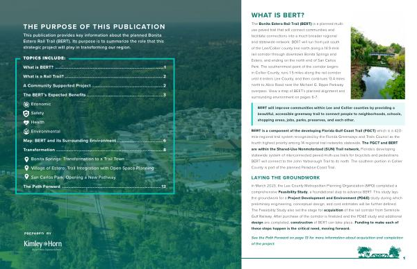 The Bonita Estero Rail Trail ( BERT ) is a planned multiuse paved trail that will connect communities and facilitate connections into a much broader regional and statewide network . BERT will run from just south of the Lee / Collier county line north along a 14.9-mile rail corridor through downtown Bonita Springs and Estero , and ending on the north end of San Carlos Park . The southernmost point of the corridor begins in Collier County , runs 1.5 miles along the rail corridor until it enters Lee County , and then continues 13.4 miles north to Alico Road near the Michael G . Rippe Parkway overpass . View a map of BERT ’ s planned alignment and surrounding environment on pages 6-7 .