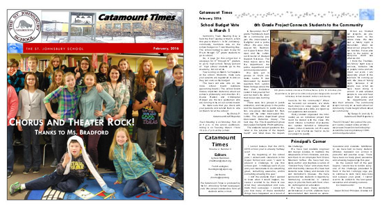 Catamount Times February, 2016 T H E S T. J O H N S B U RY S C H O O L CHORUS AND THEATER ROCK! THANKS TO MS. BRADFORD 1