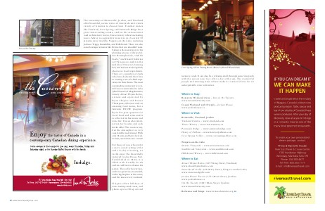 The townships of Beamsville, Jordan, and Vineland offer beautiful, scenic views of vineyards and a wide variety of wineries to choose from. Familiar names like Vineland, Cave Spring, and Peninsula Ridge have great wine tasting rooms, and for the serious wine( and architecture) lovers, Tawse winery offers fascinating tours. Many recognizable wineries are located 30 minutes away in idyllic Niagara-on-the-Lake, including Jackson Triggs, Inniskillin, and Hillebrand. There are also some boutique wineries like Stratus that you shouldn’ t miss. Eating is the easiest part of the planning process. I always follow the simple credo,“ Ask the locals,” and it hasn’ t failed me yet! Niagara is right in the middle of Ontario’ s farming belt, and the best meals regularly showcase local ingredients. There are a number of chefs who have dedicated their lives to creating a one-of-a-kind experience for their diners. The most outstanding restaurant we visited was recommended to us by John Howard of Megalomaniac winery. About Thyme Bistro, owned and operated by Ryan Shapiro and Donna Thompson, offers not only an amazing food menu, but a fantastic BYOW program. Ryan has great passion for local food and wine and it is reflected in his menu and wine list. It is an ideal destination for foodies and cork dorks alike! The room is tiny, but the atmosphere is very comfortable and relaxed. With only 38 seats, and heavy local demands, reservations are a must!