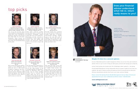 Todd Antonation Bogle Vineyards 2007 Petite Sirah, California $ 19.99 Inky in colour, this Syrah’ s explosive aromas of ripe blackberries and plums give way to a silky smooth mouthfeel of blueberry and strawberry jam. The finish is a long, sensuous melody of blended vanilla beans and espresso. Pair this with slow-cooked beef or enjoy a glass by itself in front of a warm fire.