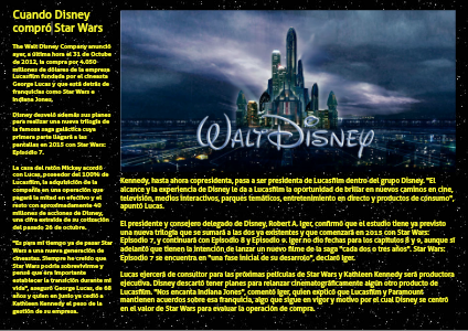 The Walt Disney Company anunció ayer, a última hora el 31 de Octube de 2012, la compra por 4.050 millones de dólares de la empresa Lucasfilm fundada por el cineasta George Lucas y que está detrás de franquicias como Star Wars e Indiana Jones.
