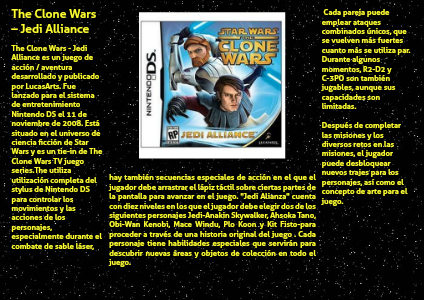 hay también secuencias especiales de acción en el que el jugador debe arrastrar el lápiz táctil sobre ciertas partes de la pantalla para avanzar en el juego. "Jedi Alianza" cuenta con diez niveles en los que el jugador debe elegir dos de los siguientes personajes Jedi-Anakin Skywalker, Ahsoka Tano, Obi-Wan Kenobi, Mace Windu, Plo Koon y Kit Fisto-para proceder a través de una historia original del juego . Cada personaje tiene habilidades especiales que servirán para descubrir nuevas áreas y objetos de colección en todo el juego.