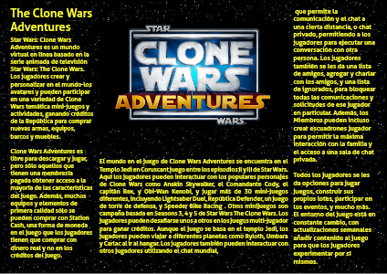 Star Wars: Clone Wars Adventures es un mundo virtual en línea basado en la serie animada de televisión Star Wars: The Clone Wars. Los jugadores crear y personalizar en el mundo-los avatares y pueden participar en una variedad de Clone Wars temática mini-juegos y actividades, ganando créditos de la República para comprar nuevas armas, equipos, barcos y muebles.