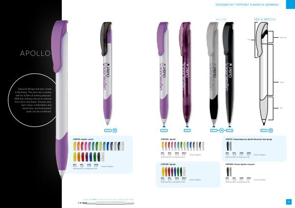 Toppoint design ball pen , made in Germany . This pen has a Jumbo refill for 4.5km of writing pleasure . With two writing colours to choose from : blue and black . Choose your own colour combination and hardcolour and transparent parts can be combined .