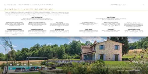 Quello che Emma Villas ha sviluppato è un modello unico , un approccio integrato Proprietario - Cliente in cui il valore e la tutela della proprietà e la qualità dei soggiorni sono due aspetti curati in modo unitario e rigoroso per garantire ai proprietari la serenità nell ’ affitto della propria dimora e agli ospiti l ’ esperienza unica di un soggiorno in ville immerse negli scenari unici del nostro Paese .