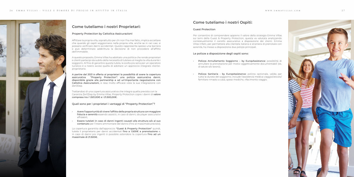 Per consentire di comprendere appieno il valore della strategia Emma Villas sui temi della Guest & Property Protection, questa va valutata analizzando contestualmente il carrello assicurativo a disposizione dei clienti. Emma Villas infatti, per permettere alla clientela italiana e straniera di prenotare con serenità, ha messo a disposizione due polizze principali.