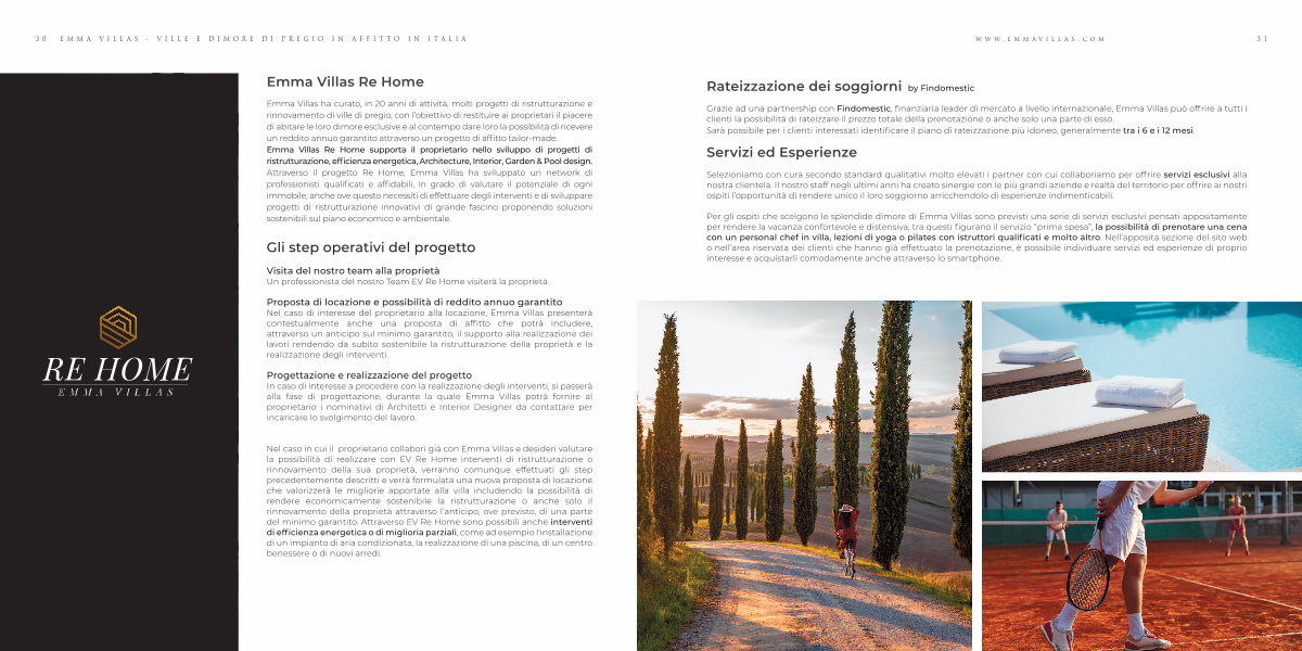 Emma Villas ha curato, in 20 anni di attività, molti progetti di ristrutturazione e rinnovamento di ville di pregio, con l’ obiettivo di restituire ai proprietari il piacere di abitare le loro dimore esclusive e al contempo dare loro la possibilità di ricevere un reddito annuo garantito attraverso un progetto di affitto tailor-made. Emma Villas Re Home supporta il proprietario nello sviluppo di progetti di ristrutturazione, efficienza energetica, Architecture, Interior, Garden & Pool design. Attraverso il progetto Re Home, Emma Villas ha sviluppato un network di professionisti qualificati e affidabili, in grado di valutare il potenziale di ogni immobile, anche ove questo necessiti di effettuare degli interventi e di sviluppare progetti di ristrutturazione innovativi di grande fascino proponendo soluzioni sostenibili sul piano economico e ambientale.