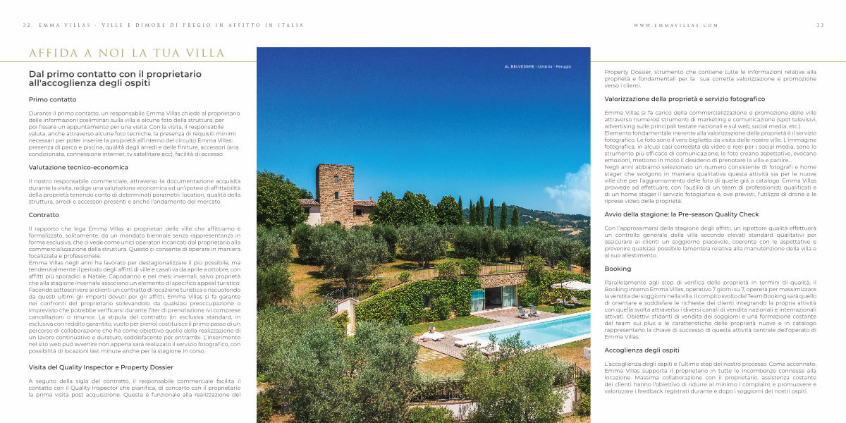 Emma Villas si fa carico della commercializzazione e promozione delle ville attraverso numerosi strumenti di marketing e comunicazione( spot televisivi, advertising sulle principali testate nazionali e sul web, social media, etc.). Elemento fondamentale inerente alla valorizzazione delle proprietà è il servizio fotografico. Le foto sono il vero biglietto da visita delle nostre ville. L ' immagine fotografica, in alcusi casi corredata da video e reel per i social media, sono lo strumento più efficace di comunicazione; le foto creano aspettative, evocano emozioni, mettono in moto il desiderio di prenotare la villa e partire … Negli anni abbiamo selezionato un numero consistente di fotografi e home stager che svolgono in maniera qualitativa questa attività sia per le nuove ville che per l’ aggiornamento delle foto di quelle già a catalogo. Emma Villas provvede ad effettuare, con l’ ausilio di un team di professionisti qualificati e di un home stager il servizio fotografico e, ove previsti, l ' utilizzo di drone e le riprese video della proprietà.