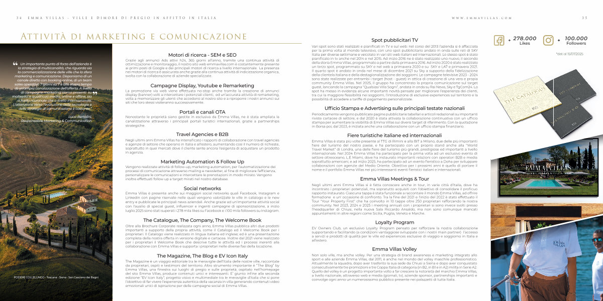 Periodicamente vengono pubblicate pagine pubblicitarie tabellari e articoli redazionali su importanti riviste cartacee di settore, e dal 2020 è stata attivata la collaborazione continuativa con un ufficio stampa per aumentare la visibilità di Emma Villas sui diversi target di riferimento. Con la quotazione in Borsa poi, dal 2023, è iniziata anche una collaborazione con un ufficio stampa finanziario.