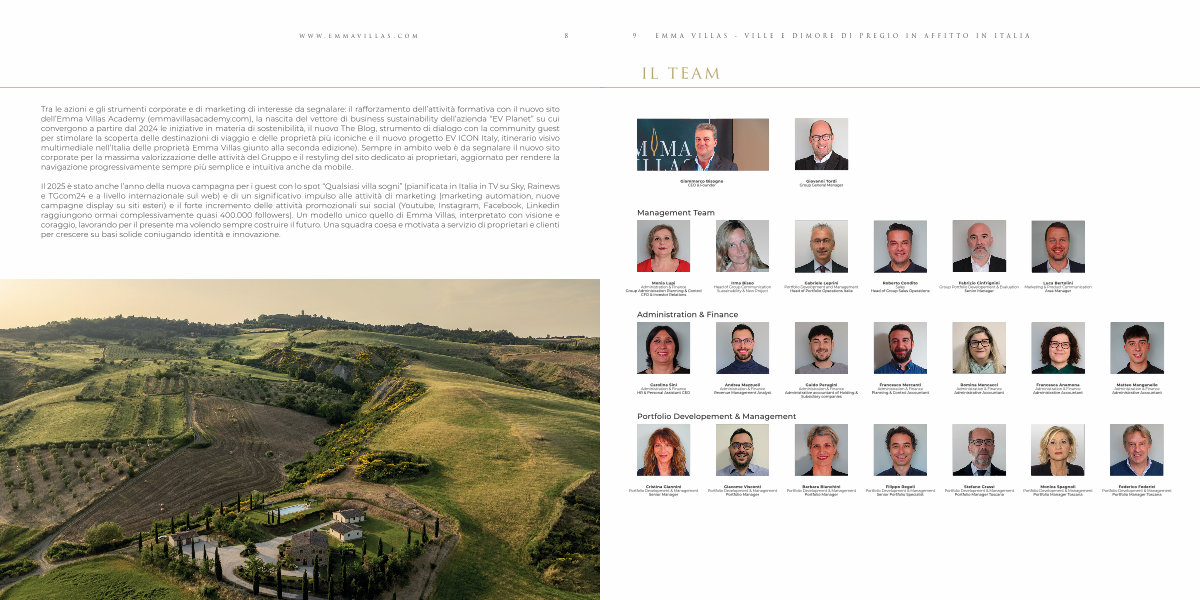 Il 2025 è stato anche l’ anno della nuova campagna per i guest con lo spot“ Qualsiasi villa sogni”( pianificata in Italia in TV su Sky, Rainews e TGcom24 e a livello internazionale sul web) e di un significativo impulso alle attività di marketing( marketing automation, nuove campagne display su siti esteri) e il forte incremento delle attività promozionali sui social( Youtube, Instagram, Facebook, Linkedin raggiungono ormai complessivamente quasi 400.000 followers). Un modello unico quello di Emma Villas, interpretato con visione e coraggio, lavorando per il presente ma volendo sempre costruire il futuro. Una squadra coesa e motivata a servizio di proprietari e clienti per crescere su basi solide coniugando identità e innovazione.
