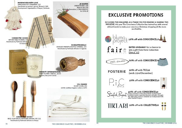 IN CLOSING THIS MAGAZINE, AS A THANK YOU FOR READING & SHARING THIS MAGAZINE, this year The Conscience Collective has teamed up with several ethical brands to make your conscious Christmas shopping all the more worthwhile.