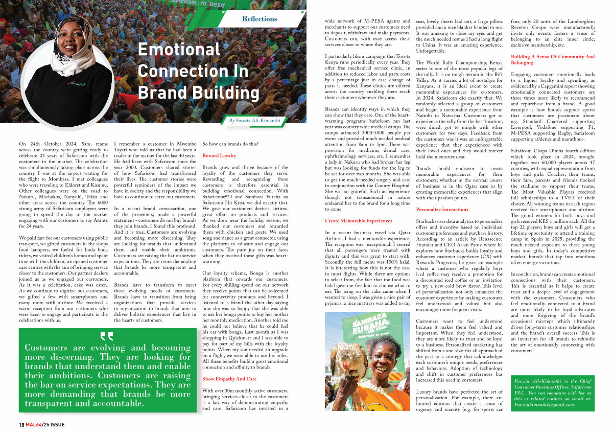 Safaricom Chapa Dimba fourth edition which took place in 2024, brought together over 60,000 players across 47 counties, with equal representation from boys and girls. Coaches, their teams, their fans, parents and friends flocked the stadiums to support their teams. The Most Valuable Players received full scholarships to a TVET of their choice. All winning teams in each region received free smartphones and airtime. The grand winners for both boys and girls received KES 1 million each. All the top 22 players; boys and girls will get a lifetime opportunity to attend a training camp in Spain in 2025, providing the much needed exposure to these young boys and girls. In today’ s competitive market, brands that tap into emotions often emerge victorious.