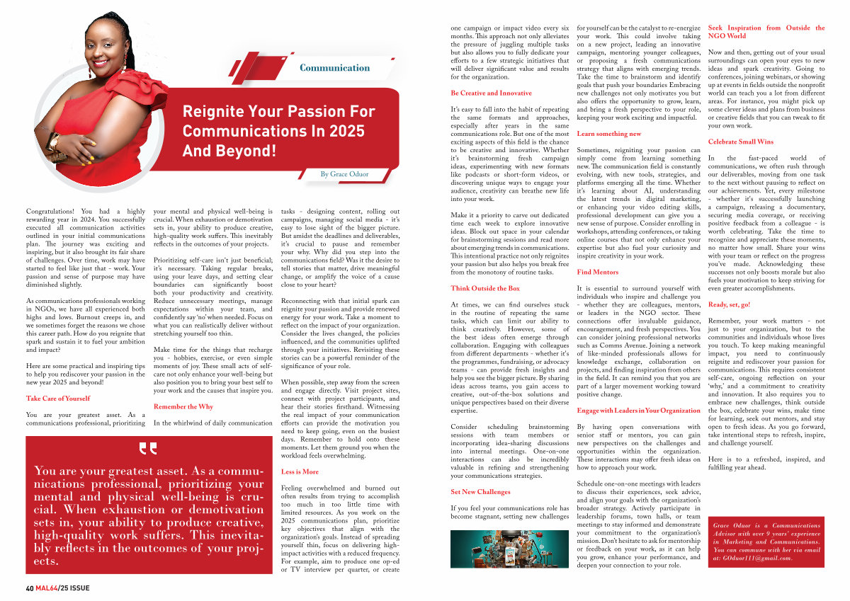 Remember, your work matters- not just to your organization, but to the communities and individuals whose lives you touch. To keep making meaningful impact, you need to continuously reignite and rediscover your passion for communications. This requires consistent self-care, ongoing reflection on your‘ why,’ and a commitment to creativity and innovation. It also requires you to embrace new challenges, think outside the box, celebrate your wins, make time for learning, seek out mentors, and stay open to fresh ideas. As you go forward, take intentional steps to refresh, inspire, and challenge yourself.