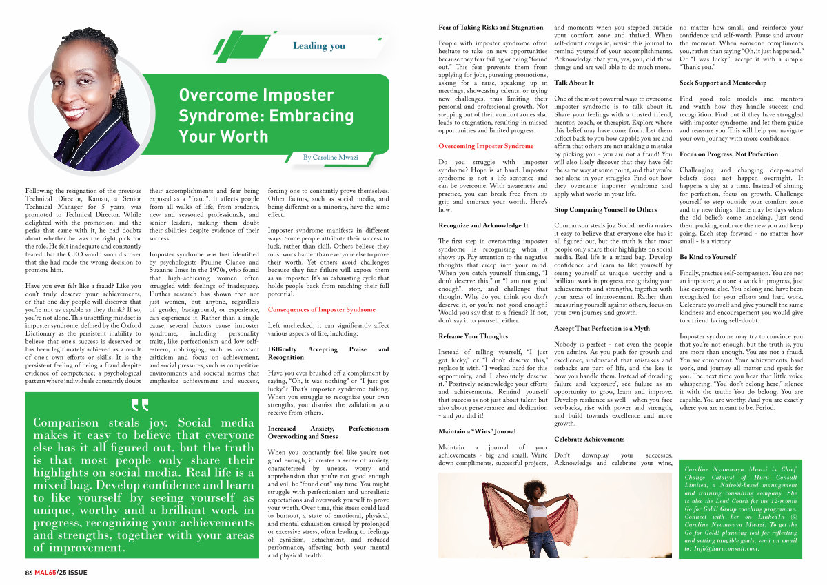 Caroline Nyamwaya Mwazi is Chief Change Catalyst of Huru Consult Limited, a Nairobi-based management and training consulting company. She is also the Lead Coach for the 12-month Go for Gold! Group coaching programme. Connect with her on LinkedIn @ Caroline Nyamwaya Mwazi. To get the Go for Gold! planning tool for reflecting and setting tangible goals, send an email to: Info @ huruconsult. com.