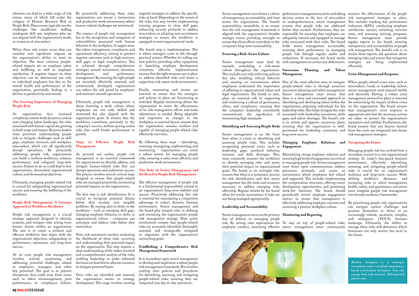 The effective management of people risk is a fundamental responsibility central to an organization’ s long-term stability and success. Proactively addressing this risk is essential for maintaining a competitive advantage in today’ s dynamic business environment. Senior management and the board play integral roles in defining and overseeing the organization’ s people risk management strategy. Their active involvement ensures that people-related risks are accurately identified, thoroughly assessed, and strategically mitigated in alignment with the organization’ s overarching goals.