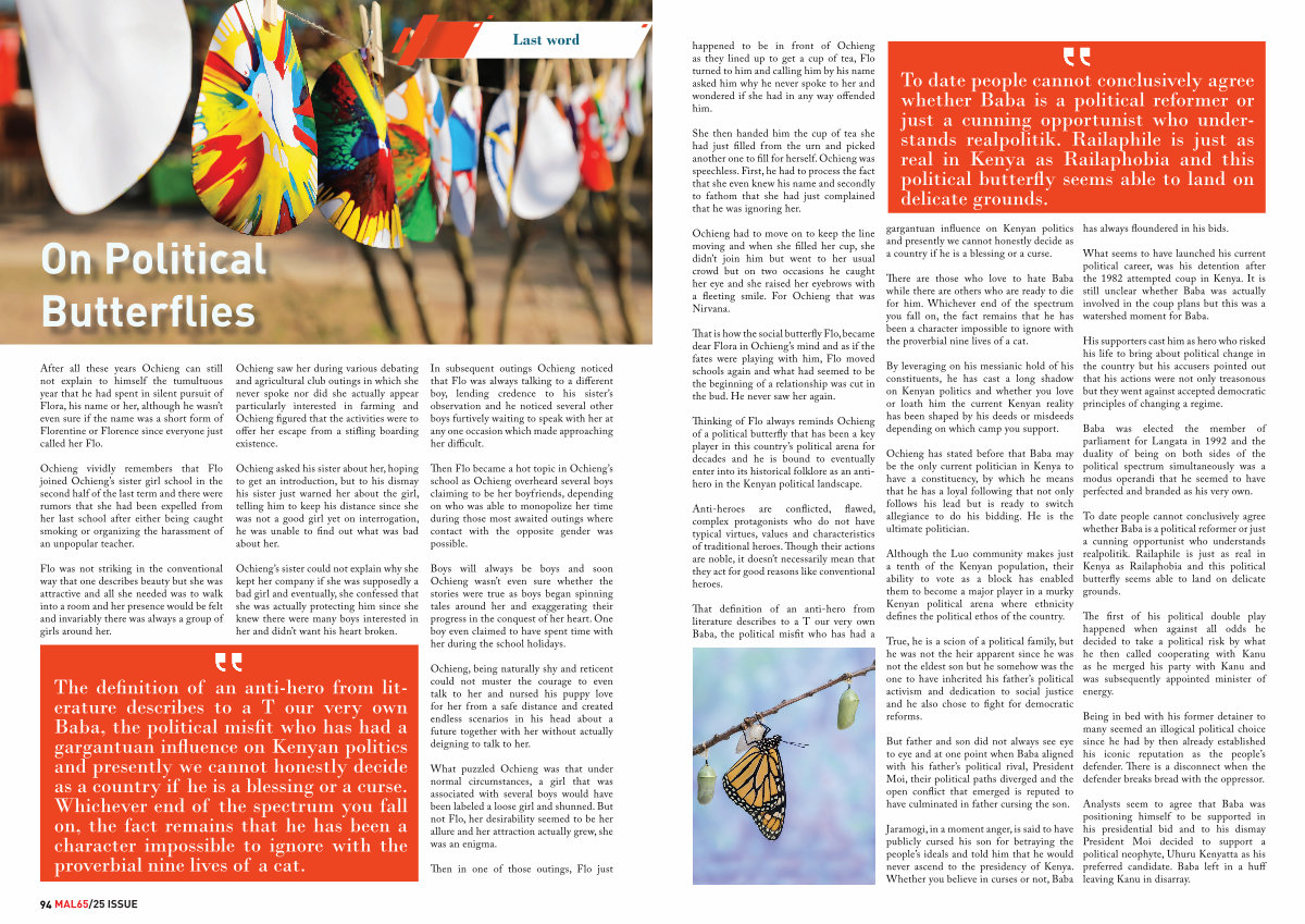 What puzzled Ochieng was that under normal circumstances, a girl that was associated with several boys would have been labeled a loose girl and shunned. But not Flo, her desirability seemed to be her allure and her attraction actually grew, she was an enigma.