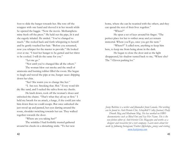 Jenny Robbins is a writer and filmmaker from Canada . Her writing can be found in Anti-Heroin Chic , Schuylkill Valley Journal , Daily Drunk Mag and Mudroom Mag . She has worked on HBO documentaries such as Bleed Out and Say Her Name . She is the non-fiction editor of Anti-Heroin Chic Magazine and works as a designer and researcher for a tech company . Learn more about her work by following Instagram / Twitter (@ bebopa _ jenny ) and visiting