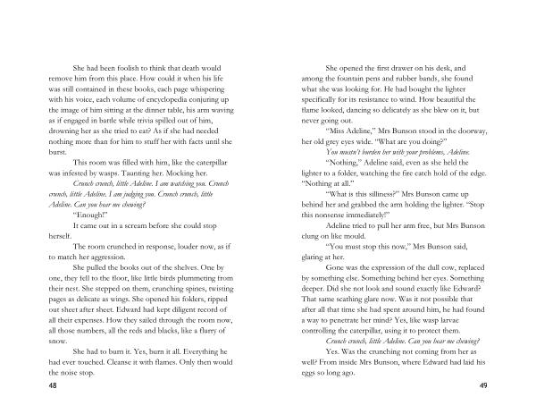 Gone was the expression of the dull cow , replaced by something else . Something behind her eyes . Something deeper . Did she not look and sound exactly like Edward ? That same scathing glare now . Was it not possible that after all that time she had spent around him , he had found a way to penetrate her mind ? Yes , like wasp larvae controlling the caterpillar , using it to protect them . Crunch crunch , little Adeline . Can you hear me chewing ? Yes . Was the crunching not coming from her as well ? From inside Mrs Bunson , where Edward had laid his eggs so long ago .