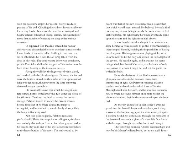 He eventually found that which he sought , and removing a bottle , wiped away the dust using the sleeve of his silk robe . Checking the label to ensure the correct vintage , Palatino turned to vacate the cavern when a breeze from out of nowhere caused the lamp to extinguish , and he was left to stand silently alone , within the black suffocating void .