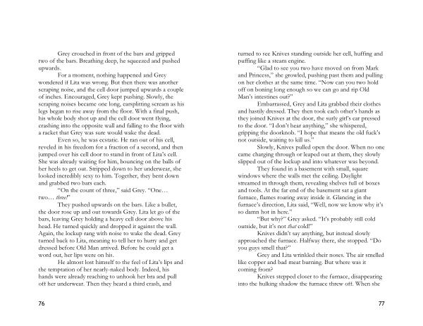 Embarrassed , Grey and Lita grabbed their clothes and hastily dressed . They then took each other ’ s hands as they joined Knives at the door , the surly girl ’ s ear pressed to the door . “ I don ’ t hear anything ,” she whispered , gripping the doorknob . “ I hope that means the old fuck ’ s not outside , waiting to kill us .”