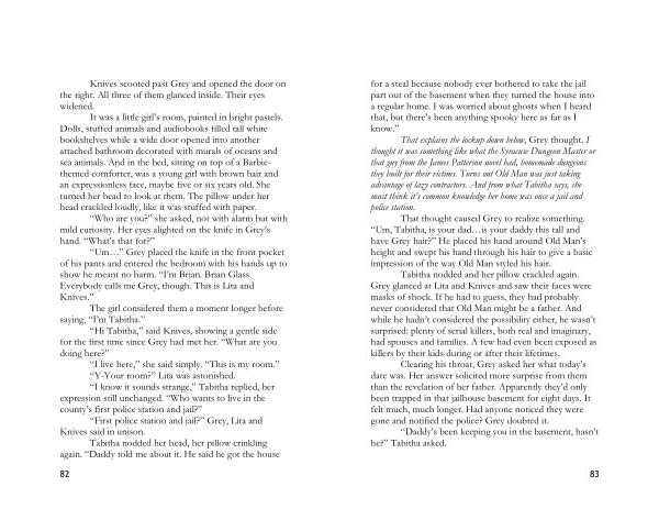 That explains the lockup down below , Grey thought . I thought it was something like what the Syracuse Dungeon Master or that guy from the James Patterson novel had , homemade dungeons they built for their victims . Turns out Old Man was just taking advantage of lazy contractors . And from what Tabitha says , she must think it ’ s common knowledge her home was once a jail and police station .