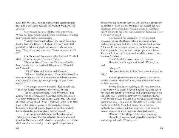 And not just her caretakers . Everyone she ’ d encounter in her life . Because this was a world where nothing was private and where dirty secrets lived forever . All it would take was one person to put Tabitha ’ s name and story on the Internet , and then people would know . They would fear her . They would watch her to make sure she wasn ’ t a threat . And if she did become a threat to them — Grey left that thought unfinished . “ F-Fine ,” he said . “ Grey —!” “ It ’ s gotta be done , Knives . You know it as well as