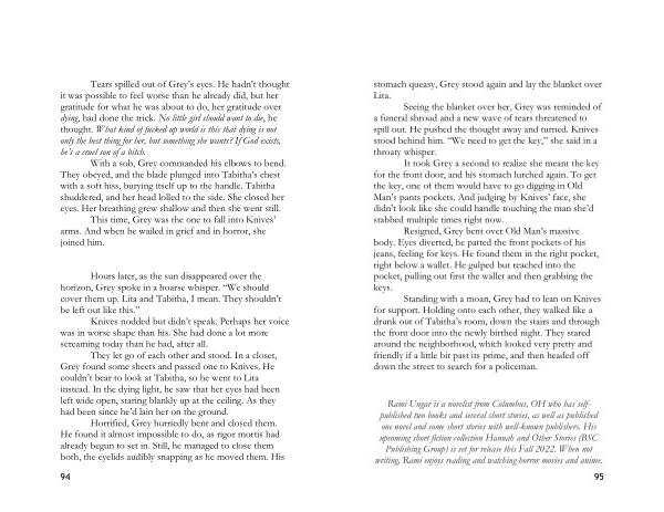 They let go of each other and stood . In a closet , Grey found some sheets and passed one to Knives . He couldn ’ t bear to look at Tabitha , so he went to Lita instead . In the dying light , he saw that her eyes had been left wide open , staring blankly up at the ceiling . As they had been since he ’ d lain her on the ground .