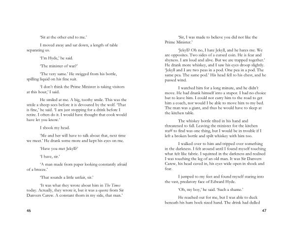 ‘ Jekyll ? Oh no , I hate Jekyll , and he hates me . We are opposites . Two sides of a cursed coin . He is fear and shyness . I am loud and alive . But we are trapped together .’ He drank more whiskey , and I saw his eyes droop slightly . ‘ Jekyll and I are two peas in a pod . One pea in a pod . The same pea . The same pod .’ His head fell to his chest , and he passed wind .
