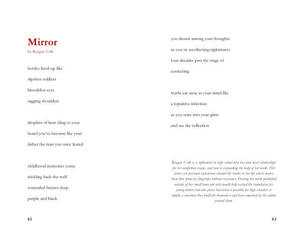 Reagan Volk is a sophomore in high school who has won local scholarships for her nonfiction essays , and now is expanding the body of her work . Her stories are personal and woven around the truths in her life which makes them flow from her fingertips without resistance . Having her work published outside of her small town not only would help extend the boundaries for young writers but also prove that what is possible for high schoolers is simply a construct they build for themselves and have cemented by the adults around them .