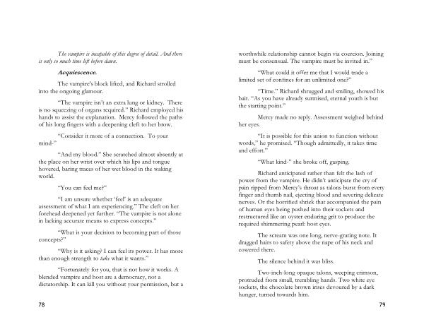 Richard anticipated rather than felt the lash of power from the vampire . He didn ’ t anticipate the cry of pain ripped from Mercy ’ s throat as talons burst from every finger and thumb nail , ejecting blood and severing delicate nerves . Or the horrified shriek that accompanied the pain of human eyes being pushed into their sockets and restructured like an oyster enduring grit to produce the required shimmering pearl : host eyes .