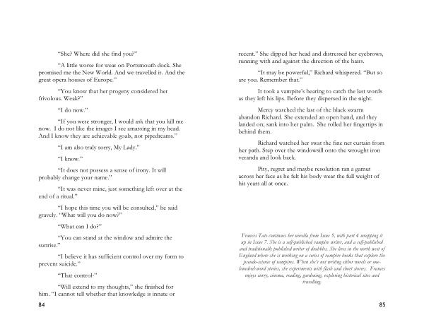 Frances Tate continues her novella from Issue 5 , with part 4 wrapping it up in Issue 7 . She is a self-published vampire writer , and a self-published and traditionally published writer of drabbles . She lives in the north west of England where she is working on a series of vampire books that explore the pseudo-science of vampires . When she ’ s not writing either novels or onehundred-word stories , she experiments with flash and short stories . Frances enjoys curry , cinema , reading , gardening , exploring historical sites and travelling .