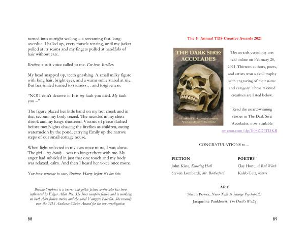 Brenda Stephens is a horror and gothic fiction writer who has been influenced by Edgar Allan Poe . She loves vampire fiction and is working on both short fiction stories and the novel Vampyre Paladin . She recently won the TDS Audience Choice Award for the her serialization .
