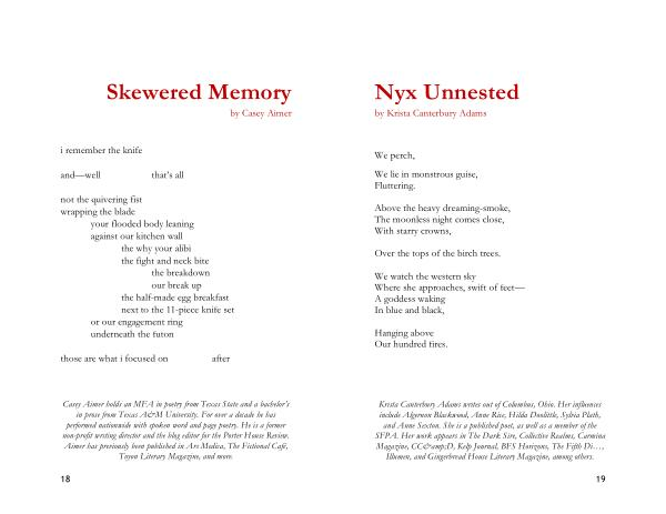 Skewered Memory by Casey Aimer i remember the knife and — well that ’ s all not the quivering fist wrapping the blade your flooded body leaning against our kitchen wall the why your alibi the fight and neck bite the breakdown our break up the half-made egg breakfast next to the 11-piece knife set or our engagement ring underneath the futon