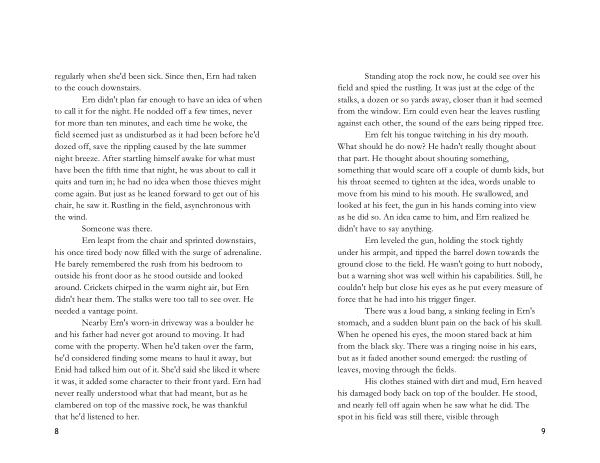 Ern didn ' t plan far enough to have an idea of when to call it for the night . He nodded off a few times , never for more than ten minutes , and each time he woke , the field seemed just as undisturbed as it had been before he ' d dozed off , save the rippling caused by the late summer night breeze . After startling himself awake for what must have been the fifth time that night , he was about to call it quits and turn in ; he had no idea when those thieves might come again . But just as he leaned forward to get out of his chair , he saw it . Rustling in the field , asynchronous with the wind . Someone was there . Ern leapt from the chair and sprinted downstairs , his once tired body now filled with the surge of adrenaline . He barely remembered the rush from his bedroom to outside his front door as he stood outside and looked around . Crickets chirped in the warm night air , but Ern didn ' t hear them . The stalks were too tall to see over . He needed a vantage point .