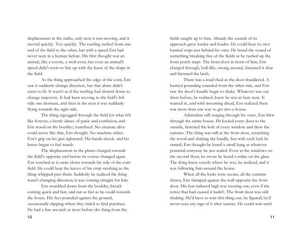 displacement in the stalks , only now it was moving , and it moved quickly . Too quickly . The rustling rushed from one end of the field to the other , but with a speed Ern had never seen in a human before . His first thought was an animal , like a coyote , a wolf even , but even an animal ' s speed didn ' t seem to line up with the haste of the shape in the field .