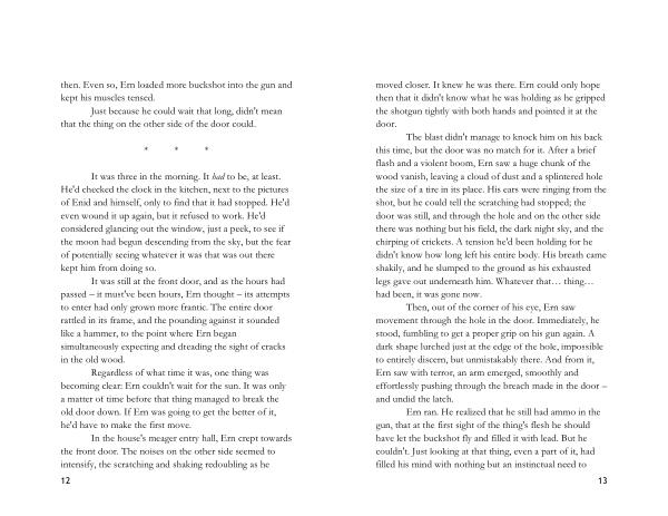 The blast didn ' t manage to knock him on his back this time , but the door was no match for it . After a brief flash and a violent boom , Ern saw a huge chunk of the wood vanish , leaving a cloud of dust and a splintered hole the size of a tire in its place . His ears were ringing from the shot , but he could tell the scratching had stopped ; the door was still , and through the hole and on the other side there was nothing but his field , the dark night sky , and the chirping of crickets . A tension he ' d been holding for he didn ' t know how long left his entire body . His breath came shakily , and he slumped to the ground as his exhausted legs gave out underneath him . Whatever that … thing … had been , it was gone now .