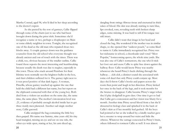 As she passed by the row of gurneys , Callie flipped through some of the charts just to see who had been brought down during the prior shift . Sometimes she ’ d recognize a name or two , perhaps a shopkeeper on Main or some elderly neighbor in town . Tonight , she recognized one of the dead as the old man who repaired shoes two blocks away . A couple gurneys down was the guidance counselor from the old school who everyone thought was already ancient and out-of-touch with the times . There was a child , too , obvious because of the smaller outline . Callie found those reports the most interesting and heartbreaking because usually the death was due to neglect , especially in this town . Those who stuck around Penshaw for their lifetime were normally not the brightest bulbs in the box , and their children suffered for it . The gurney right next to it was proof positive of that dark legacy . A woman , Priscilla , whose gurney touched up against the one that held the child had a different last name , but her report on the clipboard connected with that of the young boy . Both died from a violent car accident on the same day , the same time , the same place . The mother ’ s intoxication level was . 21 , evidence of probably enough alcohol inside her to get three sturdy men plastered . Another sad single mother story , Callie guessed .