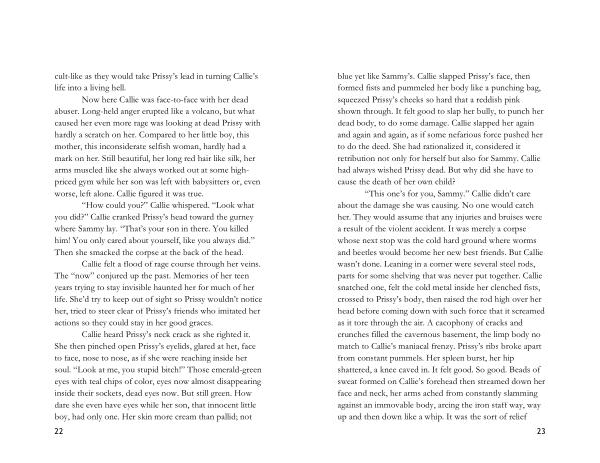 Callie heard Prissy ’ s neck crack as she righted it . She then pinched open Prissy ’ s eyelids , glared at her , face to face , nose to nose , as if she were reaching inside her soul . “ Look at me , you stupid bitch !” Those emerald-green eyes with teal chips of color , eyes now almost disappearing inside their sockets , dead eyes now . But still green . How dare she even have eyes while her son , that innocent little boy , had only one . Her skin more cream than pallid ; not
