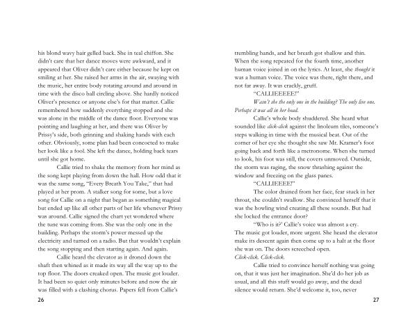 Callie tried to shake the memory from her mind as the song kept playing from down the hall . How odd that it was the same song , “ Every Breath You Take ,” that had played at her prom . A stalker song for some , but a love song for Callie on a night that began as something magical but ended up like all other parts of her life whenever Prissy was around . Callie signed the chart yet wondered where the tune was coming from . She was the only one in the building . Perhaps the storm ’ s power messed up the electricity and turned on a radio . But that wouldn ’ t explain the song stopping and then starting again . And again .