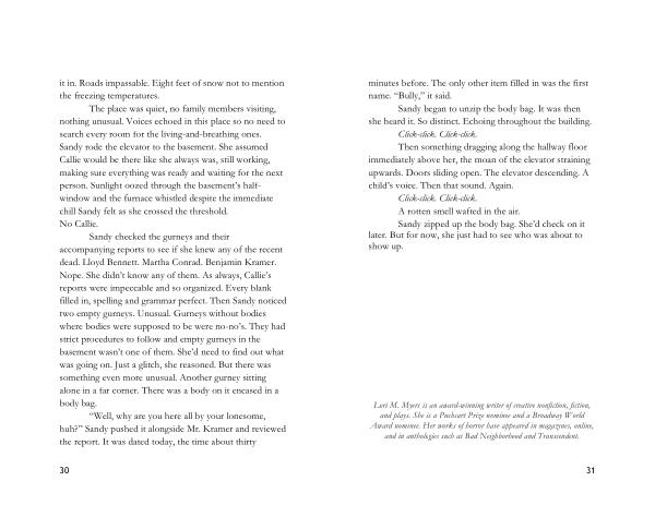 Sandy checked the gurneys and their accompanying reports to see if she knew any of the recent dead . Lloyd Bennett . Martha Conrad . Benjamin Kramer . Nope . She didn ’ t know any of them . As always , Callie ’ s reports were impeccable and so organized . Every blank filled in , spelling and grammar perfect . Then Sandy noticed two empty gurneys . Unusual . Gurneys without bodies where bodies were supposed to be were no-no ’ s . They had strict procedures to follow and empty gurneys in the basement wasn ’ t one of them . She ’ d need to find out what was going on . Just a glitch , she reasoned . But there was something even more unusual . Another gurney sitting alone in a far corner . There was a body on it encased in a body bag .