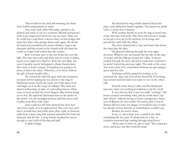 He glanced sidelong through the now-open doorway . What he saw was merely the far side of the ring of stones and the hilltops around the valley . A breeze swirled through the door and Jona would have vomited if he hadn ’ t fasted the previous night . The stink of the curse was worse than ever , somewhere between an open plaguegrave and hot sick .