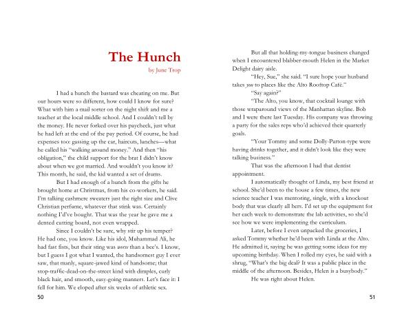 I had a hunch the bastard was cheating on me . But our hours were so different , how could I know for sure ? What with him a mail sorter on the night shift and me a teacher at the local middle school . And I couldn ’ t tell by the money . He never forked over his paycheck , just what he had left at the end of the pay period . Of course , he had expenses too : gassing up the car , haircuts , lunches — what he called his “ walking around money .” And then “ his obligation ,” the child support for the brat I didn ’ t know about when we got married . And wouldn ’ t you know it ? This month , he said , the kid wanted a set of drums .