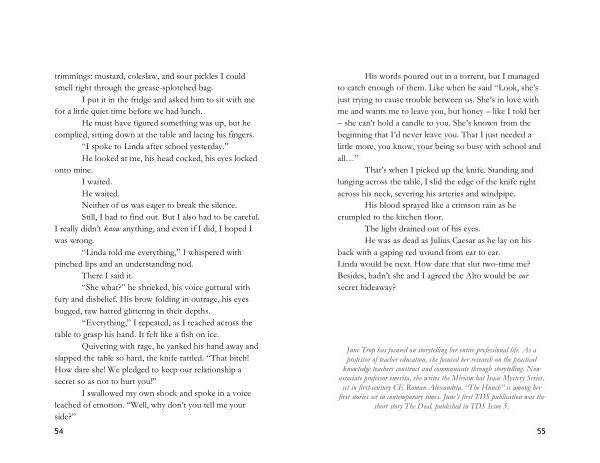June Trop has focused on storytelling her entire professional life . As a professor of teacher education , she focused her research on the practical knowledge teachers construct and communicate through storytelling . Now associate professor emerita , she writes the Miriam bat Isaac Mystery Series , set in first-century CE Roman Alexandria . “ The Hunch ” is among her first stories set in contemporary times . June ’ s first TDS publication was the short story The Deal , published in TDS Issue 5 .