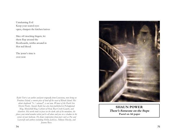Kaleb Tutt is an author and poet originally from Louisiana , now living on Prudence Island , a remote piece of land off the coast of Rhode Island . His debut chapbook " ir / rational ", is out now . Winner of the Dark Sire Horror Poetry Award , Kaleb has also been published in Perhappened Mag , Moonchild Mag , Cabinet of Heed , Bear Creek Gazette , and elsewhere . His work tends to focus on the dark side of the mundane , the places your mind wanders when you ' re all alone and you see a shadow in the corner of your bedroom . He draws inspiration from poets such as Poe and Lovecraft and authors including Shirley Jackson , Alduous Huxley , and Joanna Russ .