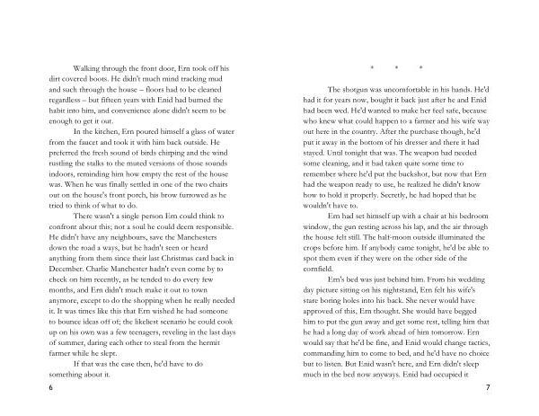 Ern had set himself up with a chair at his bedroom window , the gun resting across his lap , and the air through the house felt still . The half-moon outside illuminated the crops before him . If anybody came tonight , he ' d be able to spot them even if they were on the other side of the cornfield .
