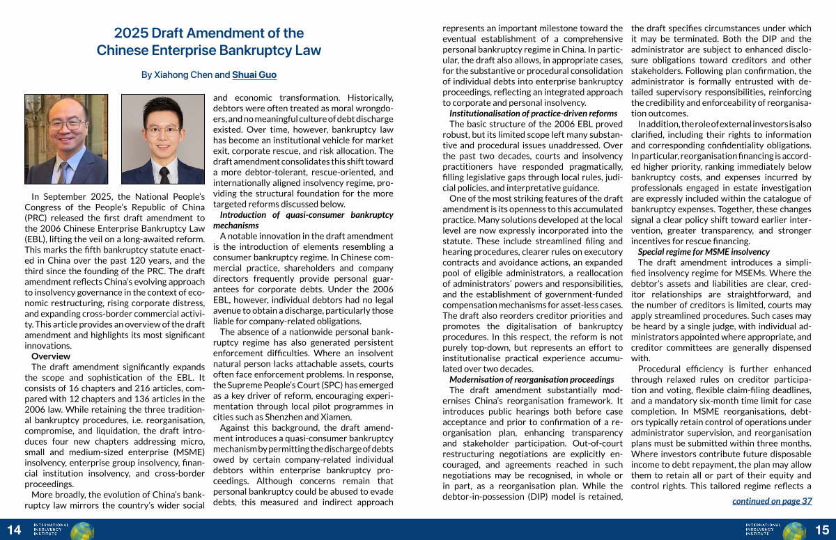 In September 2025, the National People’ s Congress of the People’ s Republic of China( PRC) released the first draft amendment to the 2006 Chinese Enterprise Bankruptcy Law( EBL), lifting the veil on a long-awaited reform. This marks the fifth bankruptcy statute enacted in China over the past 120 years, and the third since the founding of the PRC. The draft amendment reflects China’ s evolving approach to insolvency governance in the context of economic restructuring, rising corporate distress, and expanding cross-border commercial activity. This article provides an overview of the draft