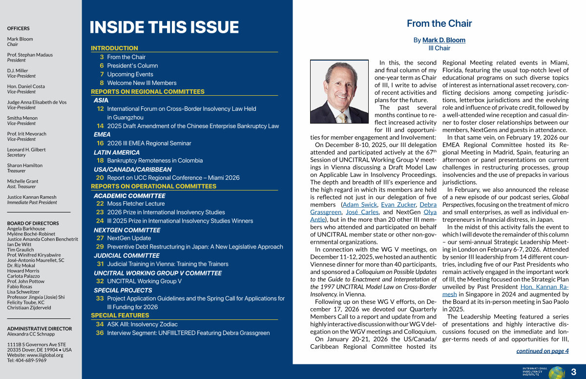 ACADEMIC COMMITTEE 22 Moss Fletcher Lecture 23 2026 Prize in International Insolvency Studies 24 III 2025 Prize in International Insolvency Studies Winners NEXTGEN COMMITTEE 27 NextGen Update 29 Preventive Debt Restructuring in Japan: A New Legislative Approach JUDICIAL COMMITTEE 31 Judicial Training in Vienna: Training the Trainers UNCITRAL WORKING GROUP V COMMITTEE 32 UNCITRAL Working Group V SPECIAL PROJECTS 33 Project Application Guidelines and the Spring Call for Applications for